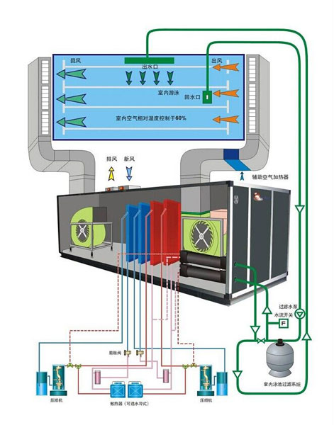 室內泳池恒溫除濕熱泵流程圖