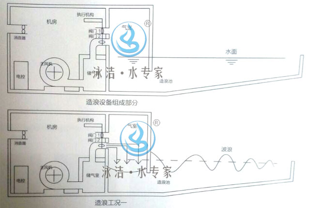 氣壓造浪系統主要蓄壓室、風機、閥門機構、風管系統、電子智能造浪是一項多學科綜合性的設備工程,它涉及空氣動力學、波浪力學、機械學、電氣控制系統學等幾門學科。但關于波浪產生的基本原理,可以形象而通俗的概括為一句成語興風作浪。它與海嘯產生原理基本一致,都是由于壓力的變化而形成波浪。